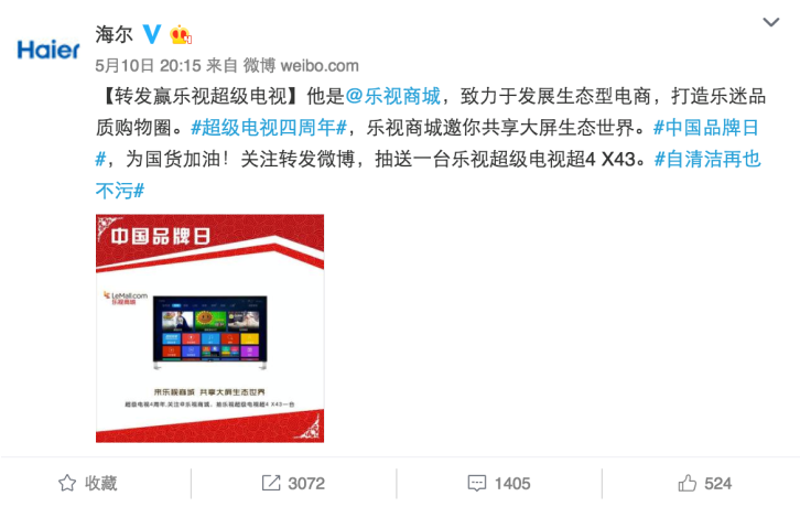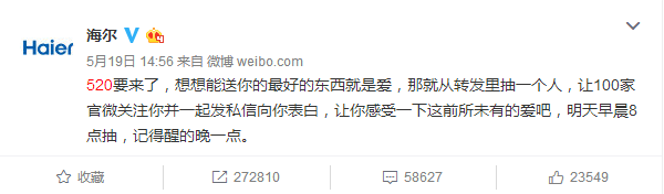 520表白日,海爾搞了一個(gè)事情,聯(lián)合60多家藍(lán)V,給一位幸運(yùn)粉絲送禮物。這條轉(zhuǎn)發(fā)評(píng)論送禮物的微博在半個(gè)小時(shí)之內(nèi)就轉(zhuǎn)發(fā)過萬(wàn)。