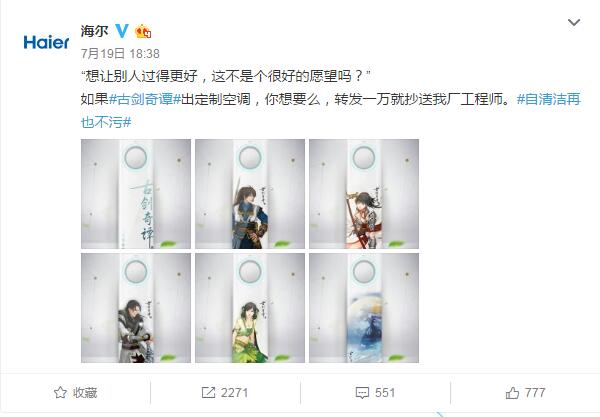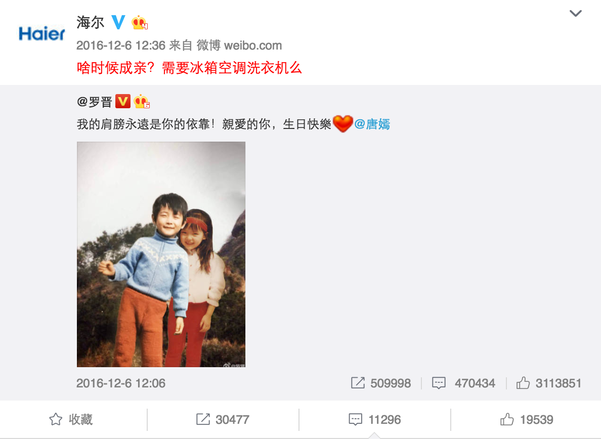 說(shuō)到海爾,大家的第一印象大多都是搶熱門。比如唐嫣羅晉公布戀情時(shí),海爾官微借勢(shì)發(fā)布微博"啥時(shí)候成親?需要冰箱空調(diào)洗衣機(jī)么"成功帶領(lǐng)了一眾藍(lán)V搞事情,因?yàn)檫@個(gè)句式很容易被模仿,所以藍(lán)V的參與度非常高。