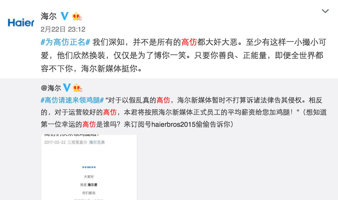 不知道從什么時(shí)候開始,平時(shí)刷微博時(shí)你會(huì)發(fā)現(xiàn)很多的高仿號(hào),潛伏于各大評(píng)論中真假難辨。@海爾作為藍(lán)V總教頭,也遇見過很多海爾的高仿號(hào),后來(lái)發(fā)現(xiàn),其實(shí)這些高仿號(hào)是海爾的年輕用戶,他們想搶熱門,跟你的粉絲有效互動(dòng)。面對(duì)這么一批可愛的小粉絲,@海爾沒有封殺,而是做官方聲明,只要你善良,且正能量,哪怕全世界都不管你我們呼喚你,甚至還給高仿號(hào)發(fā)福利。
